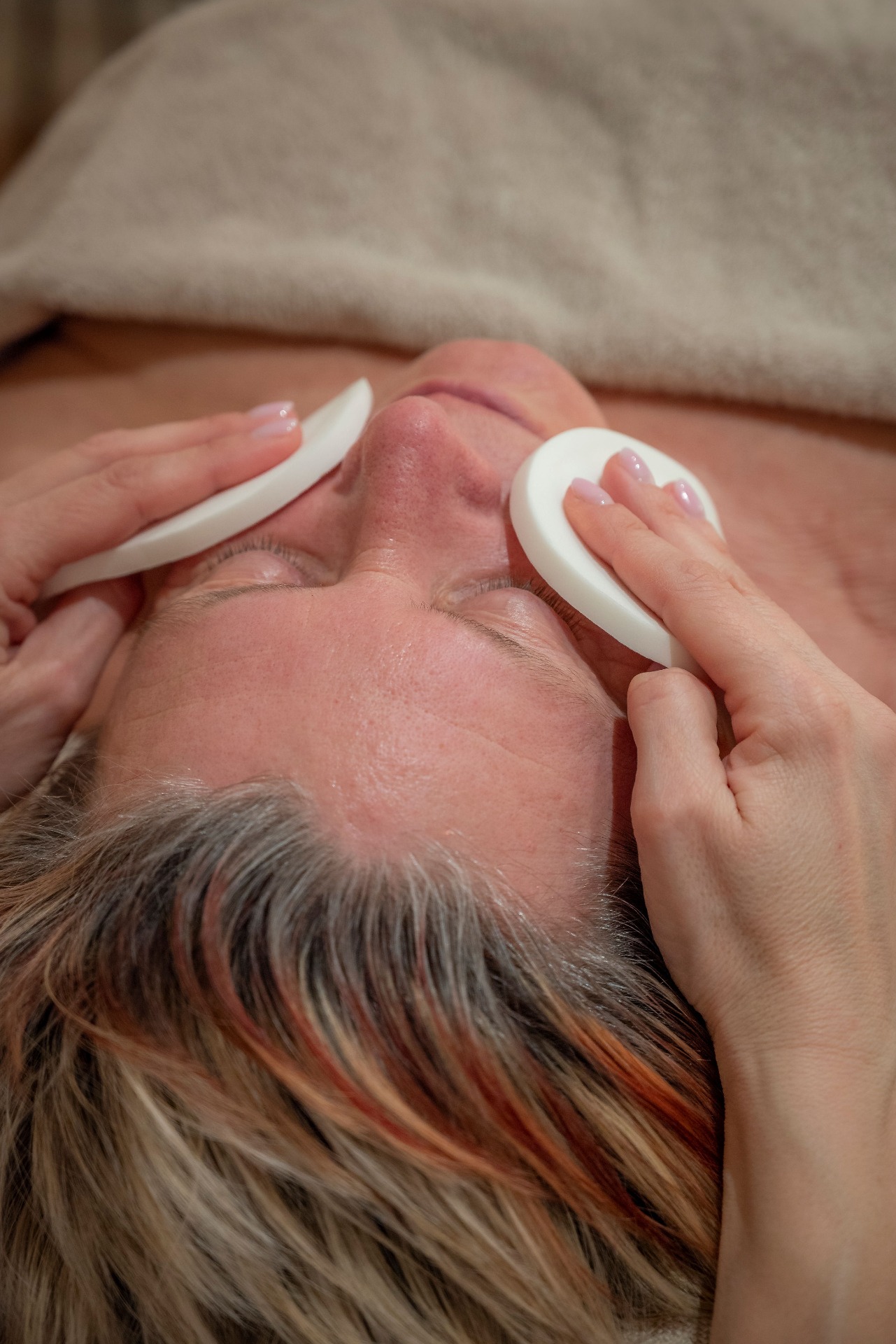 De behandeling start met warme doeken en een natuurlijke reiniging.